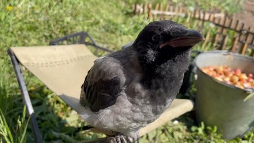 Воронёнок выпал из гнезда. 3й день ходит по всем дачам и ест кошачий корм