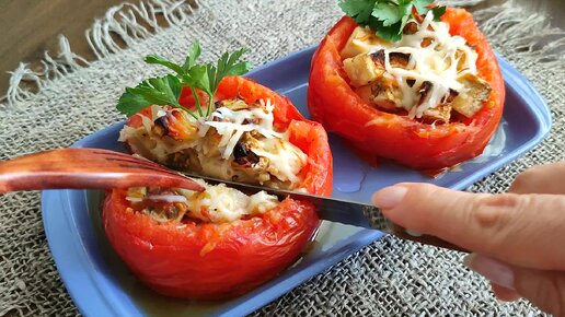 Красивый рецепт закуски: запечённые томаты с баклажаном в духовке