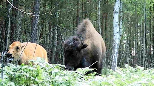 Стадо взрослых бизонов и теленок в начале лета
