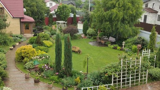 Наш участок и сад с высоты. Общий вид на цветники и посадки.