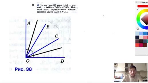 №51. На рисунке 38 угол AOD— прямой, ∠AOB = = ∠BOC = Z∠COD. Найдите угол, образованный