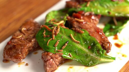Жареная говядина с личинками мучного жука и соусом из перца чили