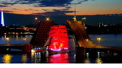 Алые паруса 2024 в Санкт-Петербурге дата 28 июня, а репетиция в ночь с 11 на 12 июня бриг Россия прошел по Неве под разведенными мостами