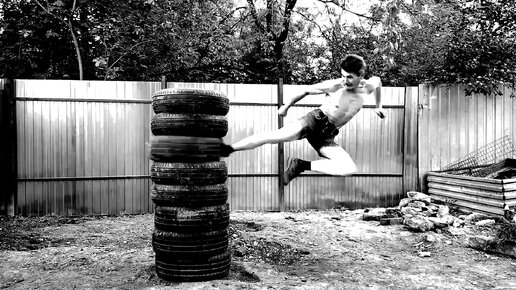 Йоко-гери. Выбиваю шины различными вариантами удара ногой в сторону. В прыжке, и с разворота.