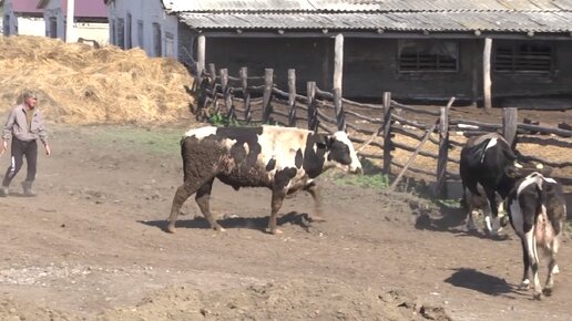 Первый выгон коров на пастбище после зимовки.