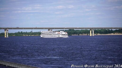 Пассажирский теплоход АЛЕКСАНДРА уходит из Волгограда на вверх.