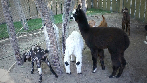 Снежная коза с козлятами и малыш альпаки, коза Камори в деревне Малые Хрусты.