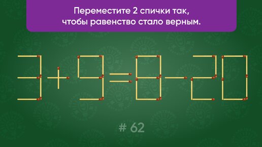 Задача со спичками № 62. Переместите 2 спички так, чтобы равенство стало верным.