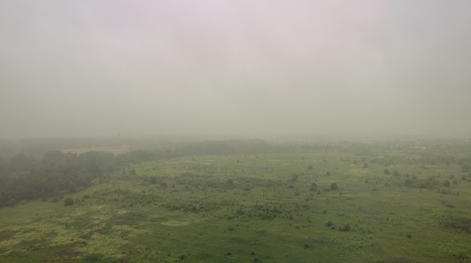 Таймлапс с высоты птичьего полета на туманное поле и деревья ранним утром