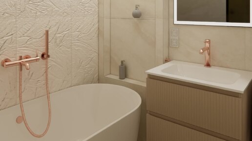 Ванная комната с отдельностоящей ванной и угловой душевой в кремовых тонах