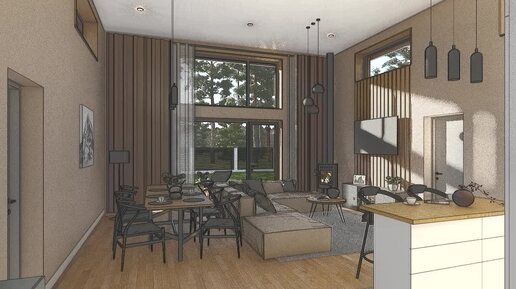 Концепт интерьера для дома с разноуровневыми потолками и вторым светом в кухне-гостиной