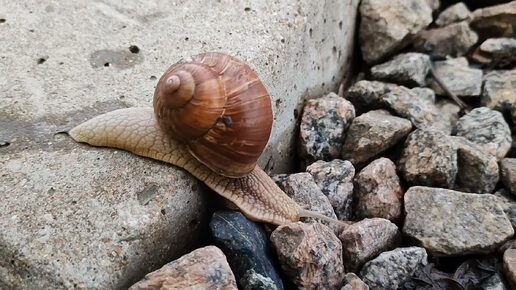 Виноградная улитка ползает по шпале на Железной дороге