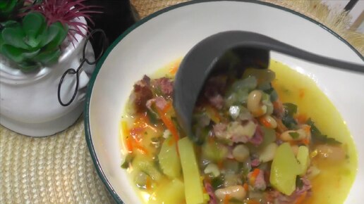 Ароматный и вкусный суп с копчеными ребрышками, фасолью и чесноком