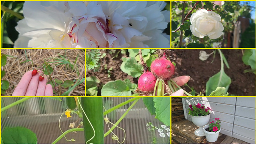СОБИРАЮ ПЕРВЫЙ УРОЖАЙ//ОБЗОР САДА//БЕЛЫЙ ПИОН ЗАЦВЕЛ!
