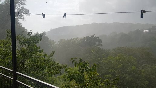Вид с террасы во время ливня в частном доме рядом с пансионатом "Бур-2" в посёлке Вишнёвка Лазаревского района Краснодарского края.