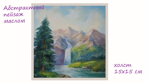 Абстрактный горный пейзаж с водопадом. Живопись маслом. Холст 15х15 см