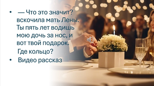 — Что это значит? вскочила мать Лены. Ты пять лет водишь мою дочь за нос, и вот твой подарок. Где кольцо? Видео рассказ