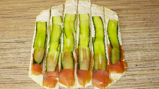 Закуска из лаваша с творожным сыром, красной рыбой и огурцами, без необходимости жарки и варки.