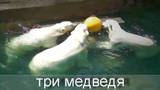 Мама Герда спряталась от жары в воду, а медвежата с желтым шаром приплыли к ней.