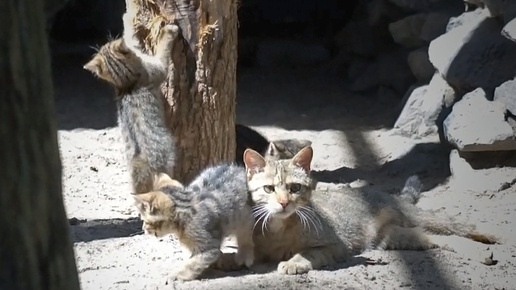 Лесные котята европейской кошки весело играют, а мама яростно их защищает.