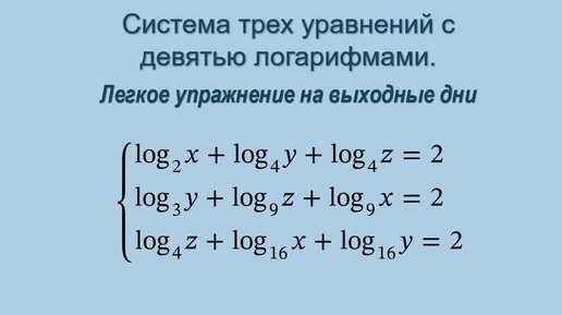 Система трех уравнений с девятью логарифмами. Легкое упражнение на выходные дни.