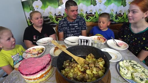 Мукбанг жареная картошка с мясом, селёдка под шубой