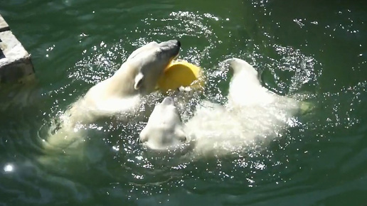 Дружная семейка, мама Герда и два медвежонка после сна прыгнули в воду.