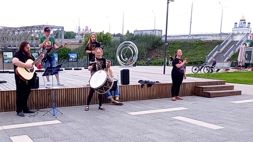 Культурный отдых в городе Елец. Живая музыка в сквере Пушкина. Волынка, барабаны и гитары, выступление колоритного коллектива.