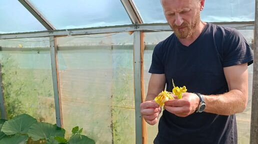 Сделал важную процедуру: опылил женский цветок гигантской тыквы. Растим большие тыквы.