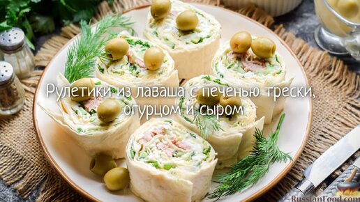 Бюджетная закуска. Рулетики из лаваша с печенью трески, огурцом и сыром