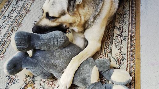 Пес Дарик раздирает игрушку