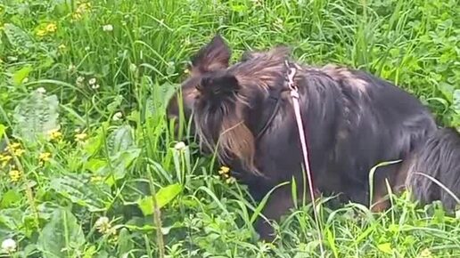 Маленькая собачка Скади любит лето за то, что можно лакомиться травкой, она ест травку в городе, на прогулке и когда уезжает на дачу