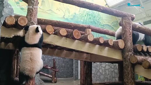 Панда Катюша демонстрирует маме навыки скалолазания