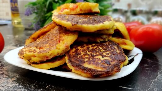 Рецепт завтрака. Оладьи с помидорами и сыром. Лепёшки на кефире.
