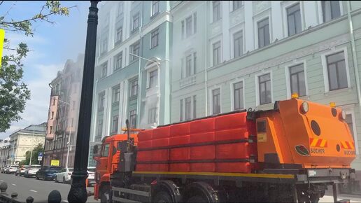 Поливомоечные машины увлажняют воздух в Москве из-за жары
