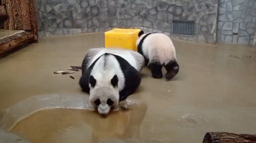Панде Катюше подарили большой желтый кубик - что же с ним сделать?
