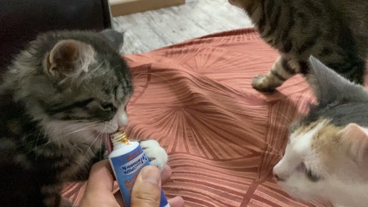 Стеша, Тая и Персик лопают пасту для вывода шерсти