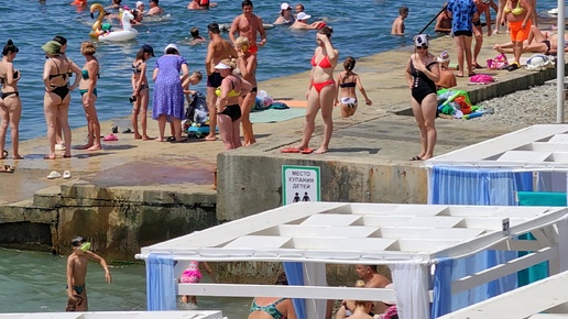 Обстановка на пляже "Малая бухта". Анапа. Июль 2024. Море чистое. Вода прогрелась до 22°С. "Плачущая" скала. Баня. Катамараны. Сап-борды.