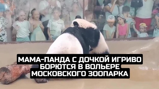 Мама-панда с дочкой игриво борются в вольере Московского зоопарка