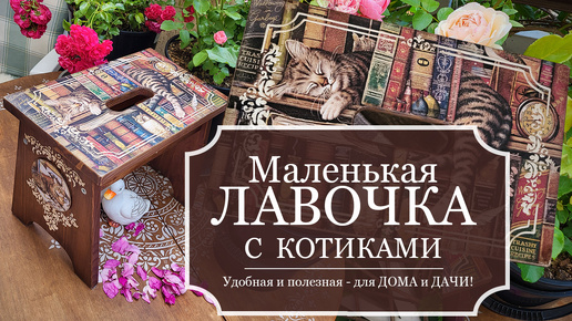 Маленькая ЛАВОЧКА (МИНИ табурет) с КОТИКАМИ - ДЕКОРирую сосновую лавочку - ДЕКУПАЖ - Удобная и полезная вещь для дома и дачи!