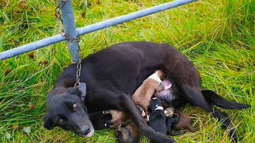 Привязанная и дрожа от холода она лежала рядом со своими 6 щенками, которые еще даже не открыли глаз