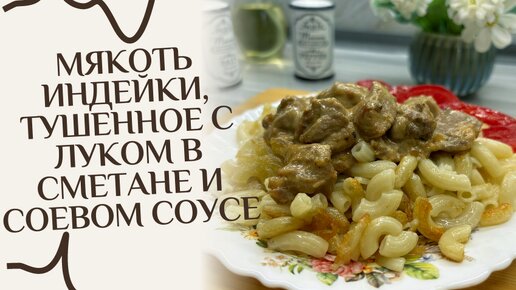 Мякоть индейки, тушенное с луком в сметане и соевом соусе