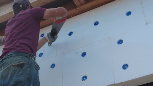 Нарушения технологии приклейки пенополистирола ППС16ф, нарушена разбежка между листами. Вырезаем, вклеиваем вкладыш на клей-пену Penosil