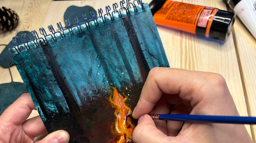 Как нарисовать ночной костер среди деревьев | Рисование акрилом