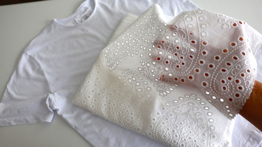 Увидела роскошное платье в магазине. Взяла белую футболку, ажурную ткань и сшила не хуже