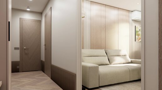 Гостиная, кухня, прихожая в квартире на Полярной. Современный уютный минималистичный дизайн.