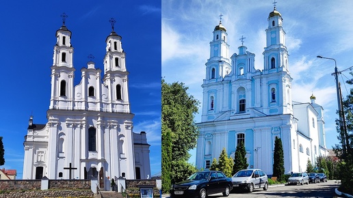 Одна площадь на двоих. Очень похожие храмы: собор Рождества Пресвятой Богородицы и костёл Святой Троицы в Глубоком. Беларусь
