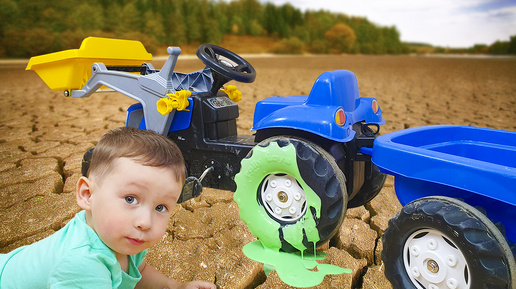 Малыш весело играет со слаймом и ездит на большом синем тракторе