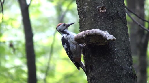 Крупный белоспинный дятел с криками восторга разносит трутовик