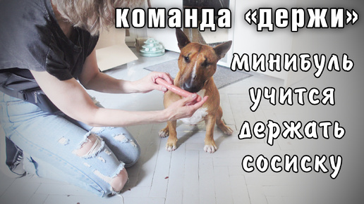 Учим с бультерьером новый трюк по удержанию сосиски. Первый урок с этим трюком.